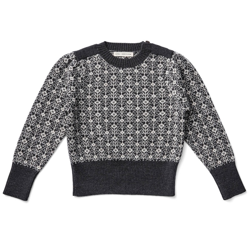 Wilma Pullover by Soor Ploom. A warm and cosy jumper in folklore stitch jacquard. With gathered shoulders and triple horn button closure.